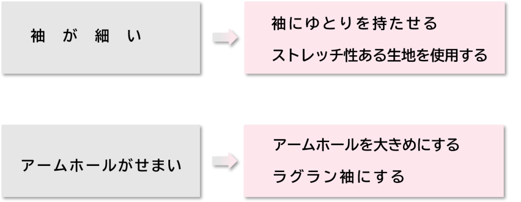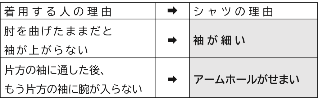 袖の通しづらい理由をシャツの理由に変えてみると改善点が浮き出てきます。