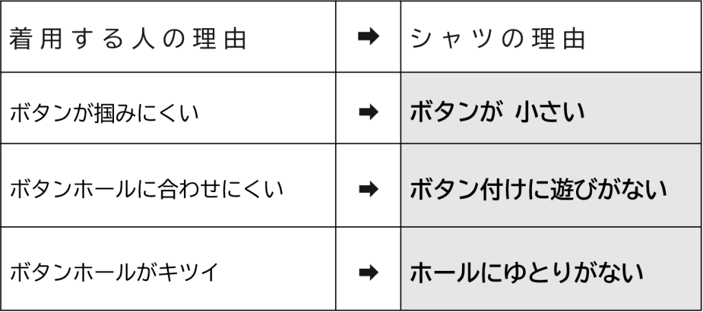 ボタンをかけづらい理由をシャツの理由に変えてみると改善点が浮き出てきます