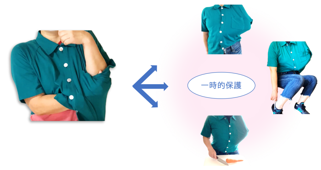 シャツを着たまま肘を内側へ。一時的に手を保護、活動的な日常生活が期待できます。