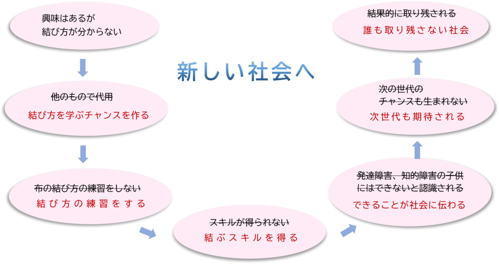 結び方のワークショプを行った際は、結びができなかった自閉症のお子様が3回目で結べるようになり、4回目は誰にも声を掛けてもらわず、ひとりで成し遂げることができました。終了後には開催場所を往復して挨拶してくれました。