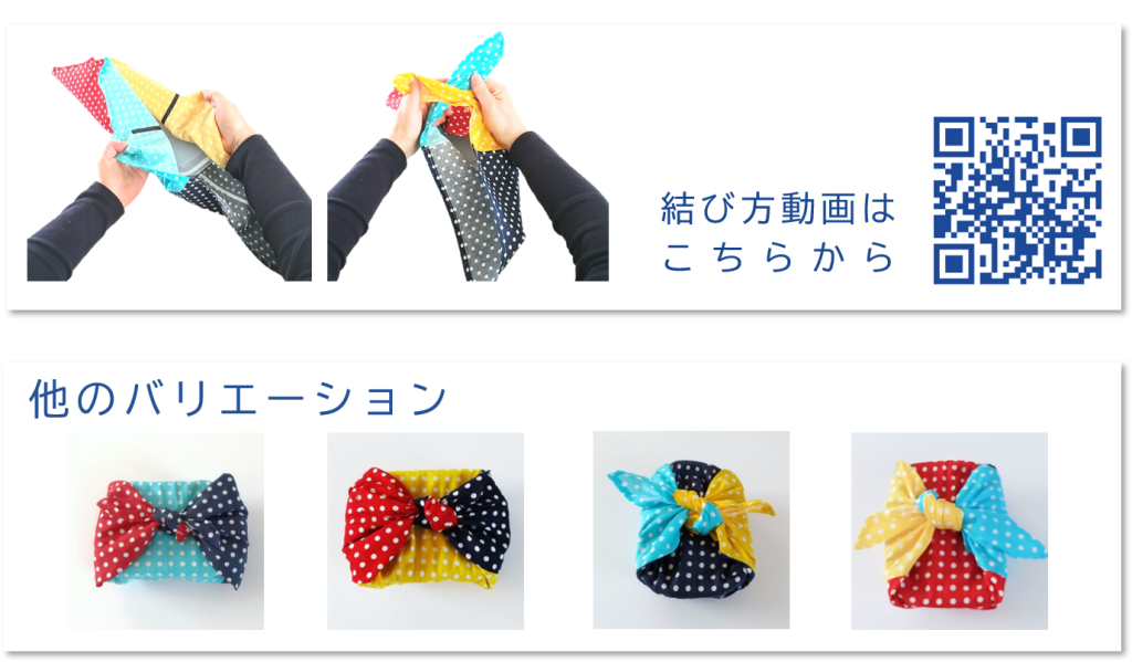 布の結び方が目で見て分かる風呂敷「包んで楽勝!」はバンダナサイズ。(お弁当包みサイズ)